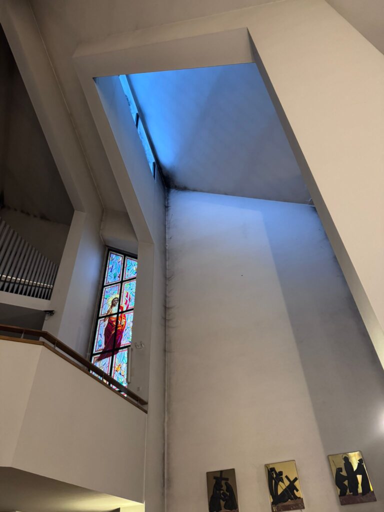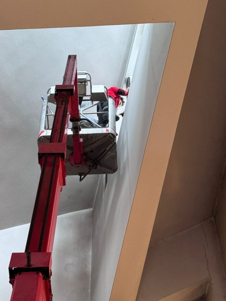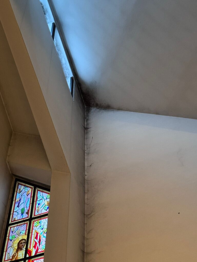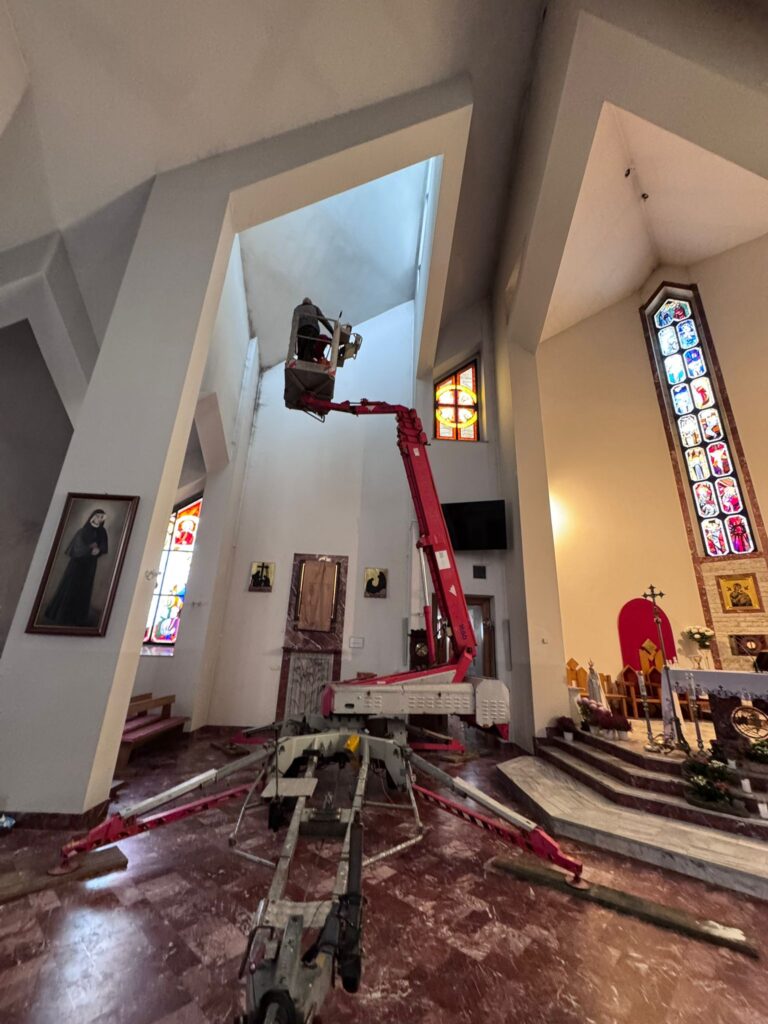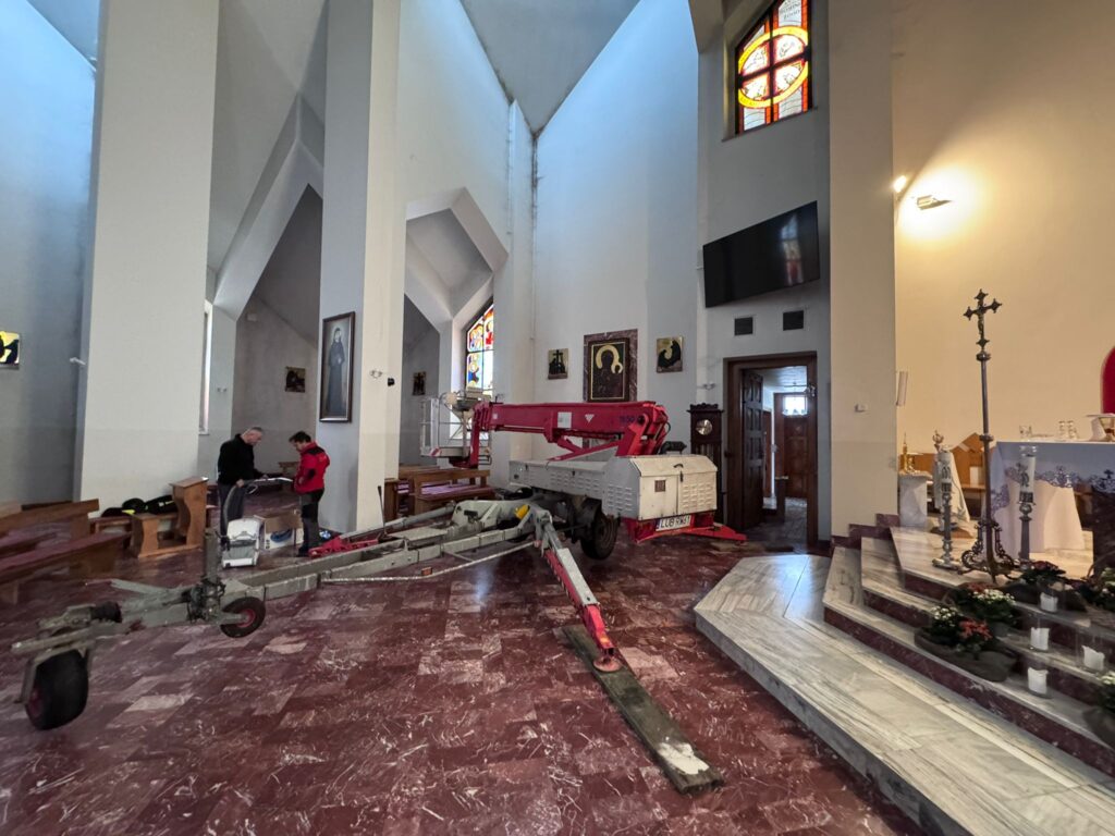 W dniach 25 oraz 26 listopada, dzięki podnośnikowi, który wjechał do środka kościoła, udało się wyczyścić wnętrze naszej świątyni z zalegających w kątach pajęczyn oraz wyczyścić czarny nalot i zaaplikować w te miejsca środek przeciwgrzybiczny.